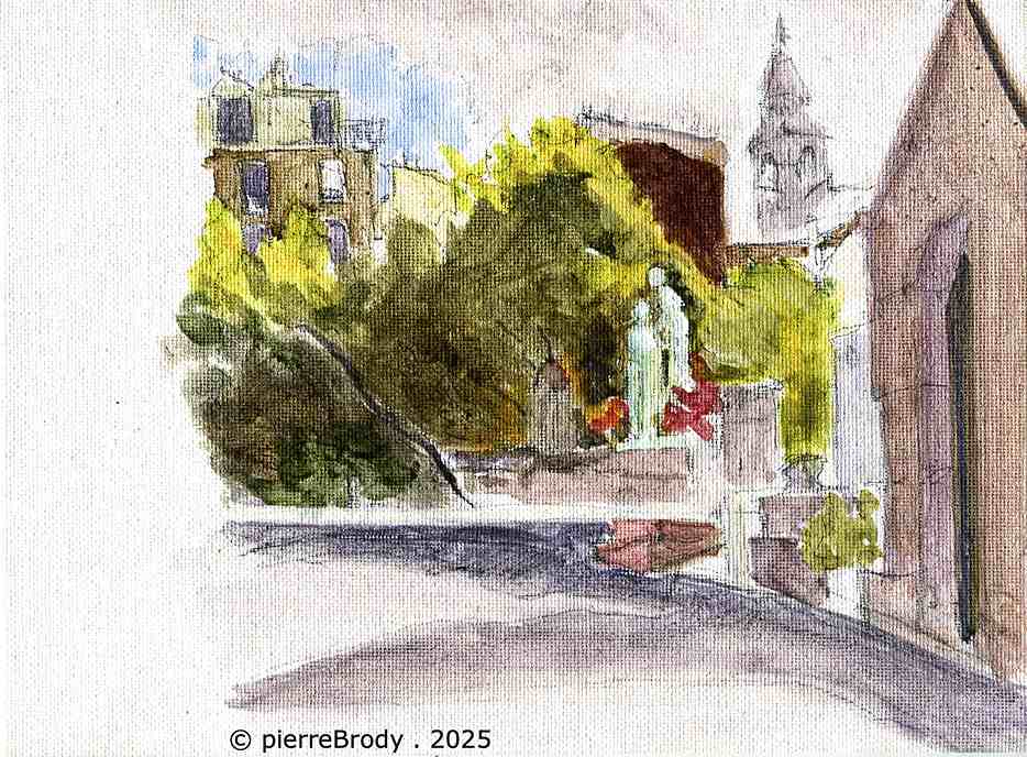 Nous nous sommes retrouvés à l’initiative des Urbansketchers de Paris dans un lotissement des années 20, le 30 août. J’ai tout de suite opté pour ce point vue qui pour moi reflétait le calme de l’endroit. Malheureusement arrivé à la fin de mon dessin il me manquait le rayon de soleil qui m’avait émoustillé au début. Et puis j’ai trop traîné à ranger mes affaires. J’ai perdu le groupe dans les chemins escarpés du square du chapeau rouge.