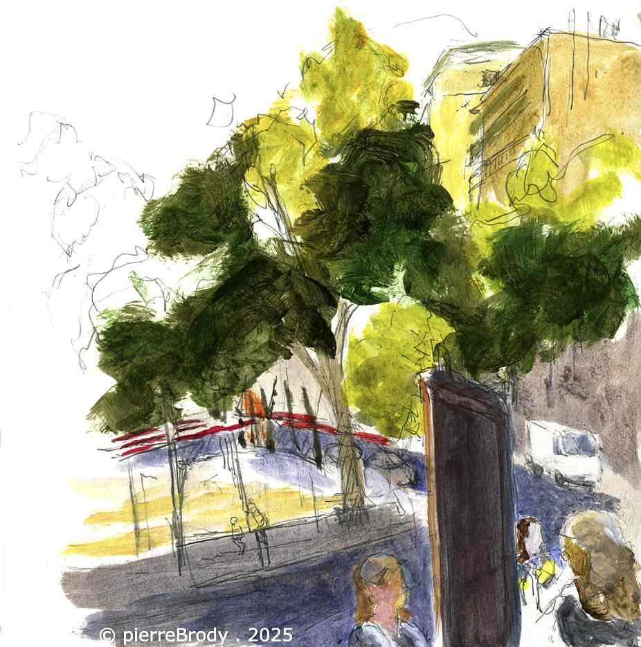Le jour fatidique où nous nous sommes retrouvés à l’invitation des Urbansketchers de Paris au cimetière St Vincent, des vents violents ont soufflé sur les arbres. Le cimetière a fermé. Je n’ai pu finir mon dessin. C’est donc en revenant à Montmartre que j’ai pu le reprendre. Acrylique sur carton entoilé.