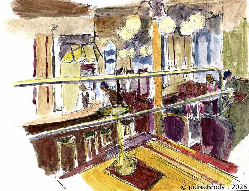 Je passe plusieurs fois par semaine par cet endroit. C’est là, devant l’Ariel Café que je tourne à droite pour aller au marché. La rue de Ménilmontant est plus en pente que ce que j’ai dessiné.