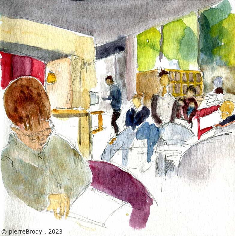 D’emblée je suis frappé par les priorités du lieu. Que les diverses composantes de la population du quartier se rencontrent et qu’elles investissent le lieu. Je cherche une place où dessiner. Si je me trompe, le dessin est fichu. Il ne faut pas non plus occuper la place de quelqu’un d’autre. Par exemple celle d’une nounou près du tapis où les bébés sont déposés pour jouer et où elles aiment se retrouver pour échanger des nouvelles. Je trouve une petite table avec un garçon et sa grand-mère. J’y suis accueilli chaleureusement. C’est un atout pour mener à bien cet exercice d’équilibriste en quoi consiste le dessin sur le vif. Comme commencer à préparer une recette de cuisine sans connaître les ingrédients dont on pourra se servir.