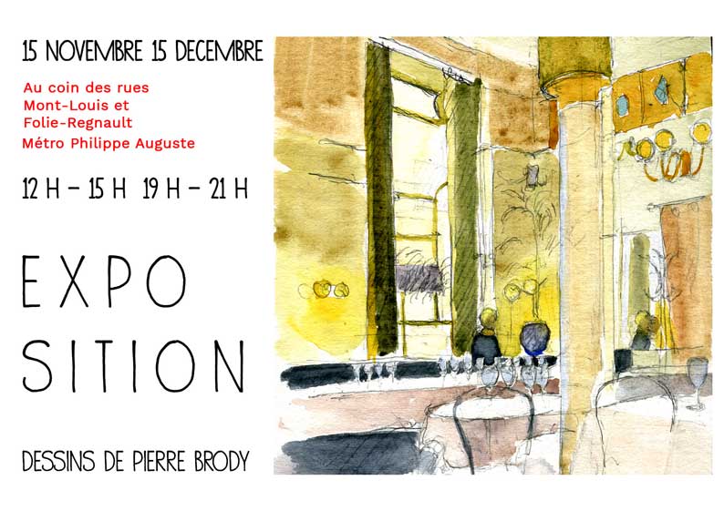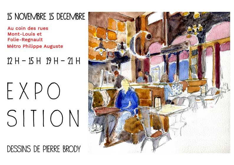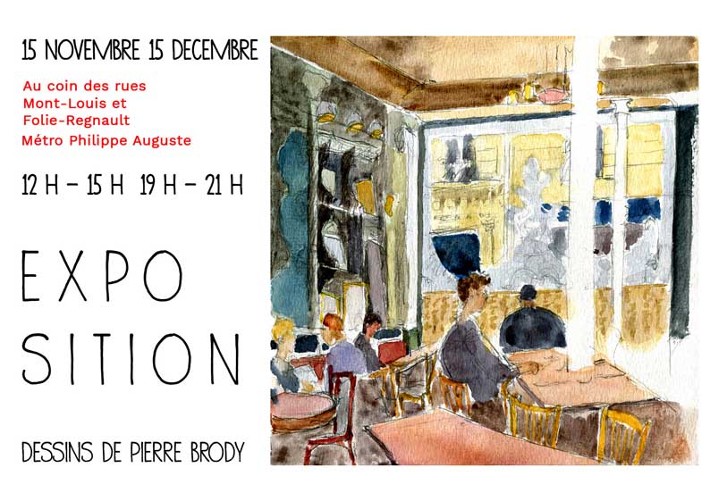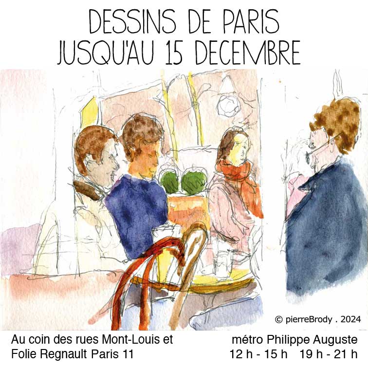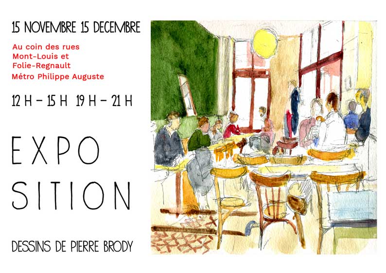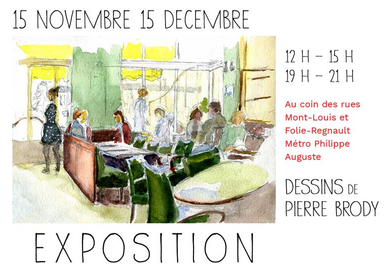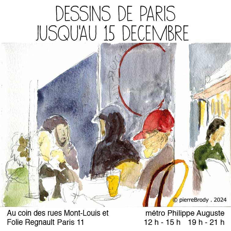 Dessins présentés à mon exposition. Le premier du marché de Belleville. Les autres du Café Pierre, près de la République.