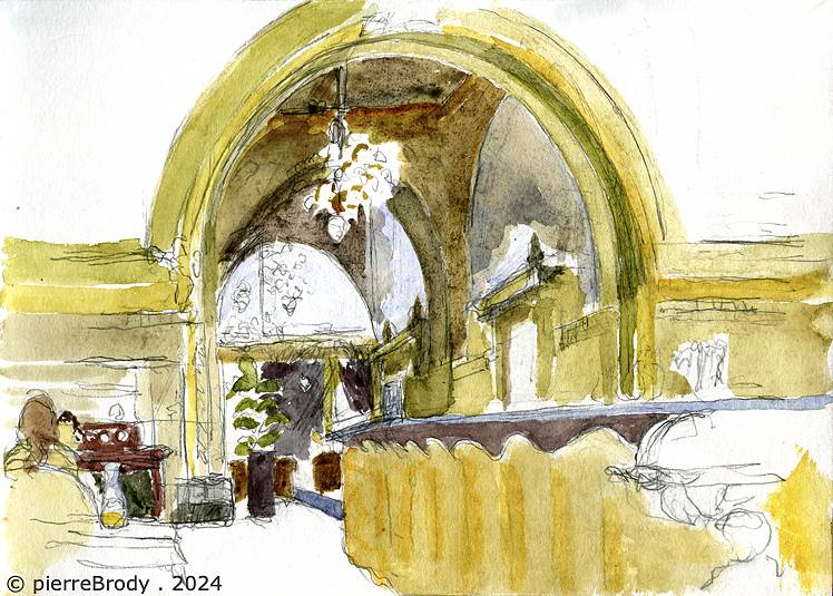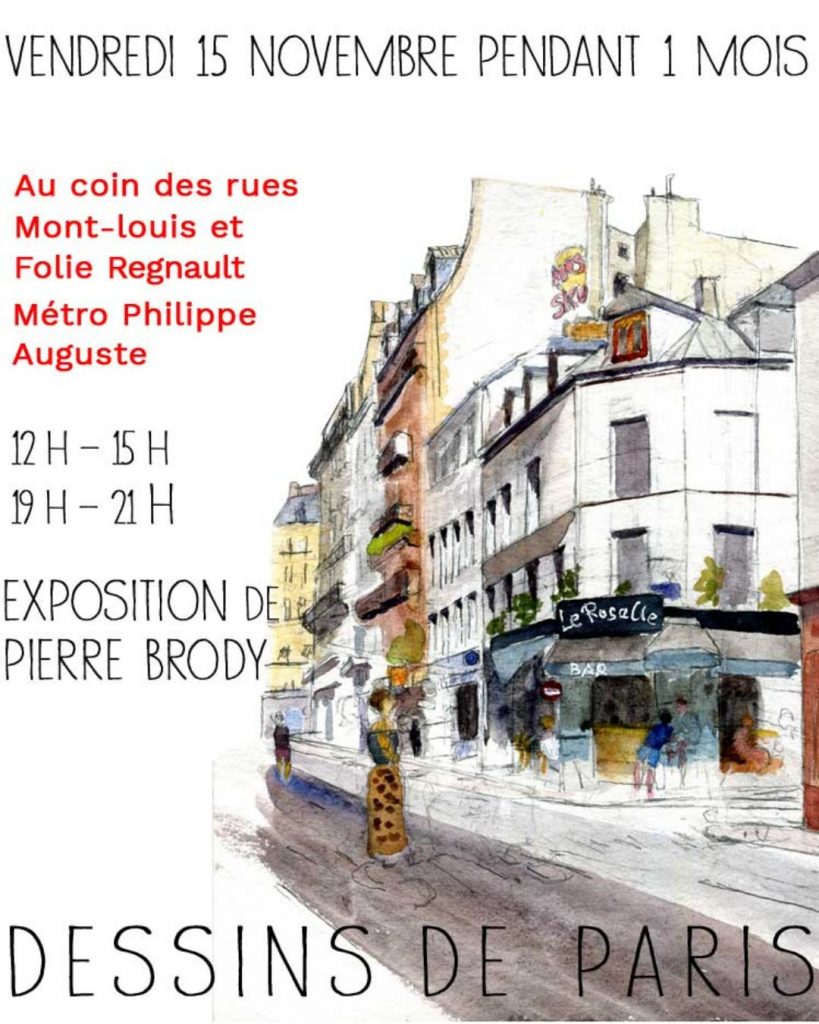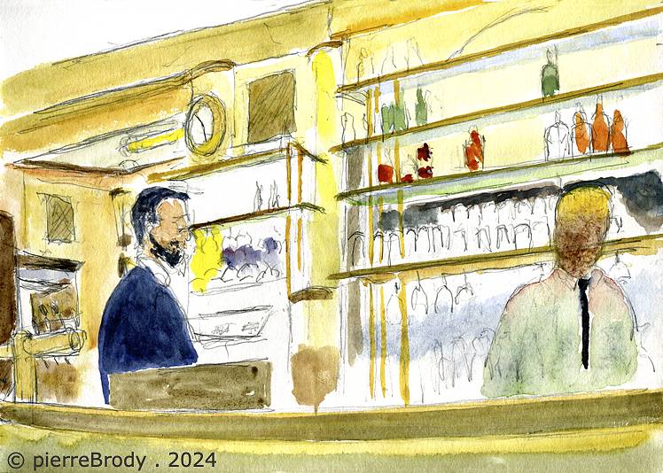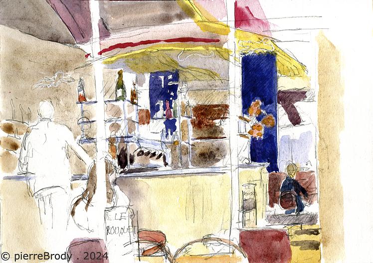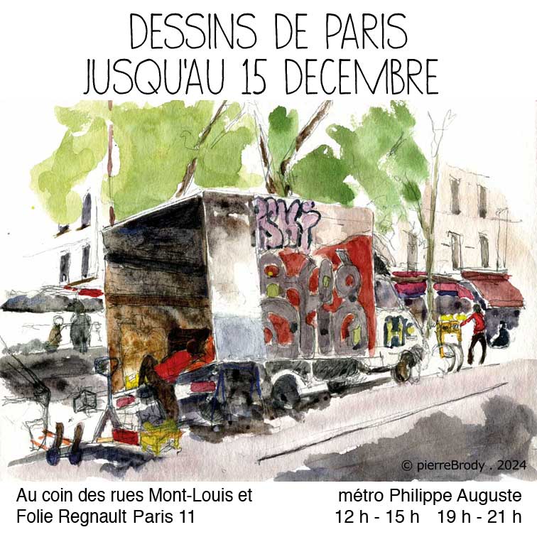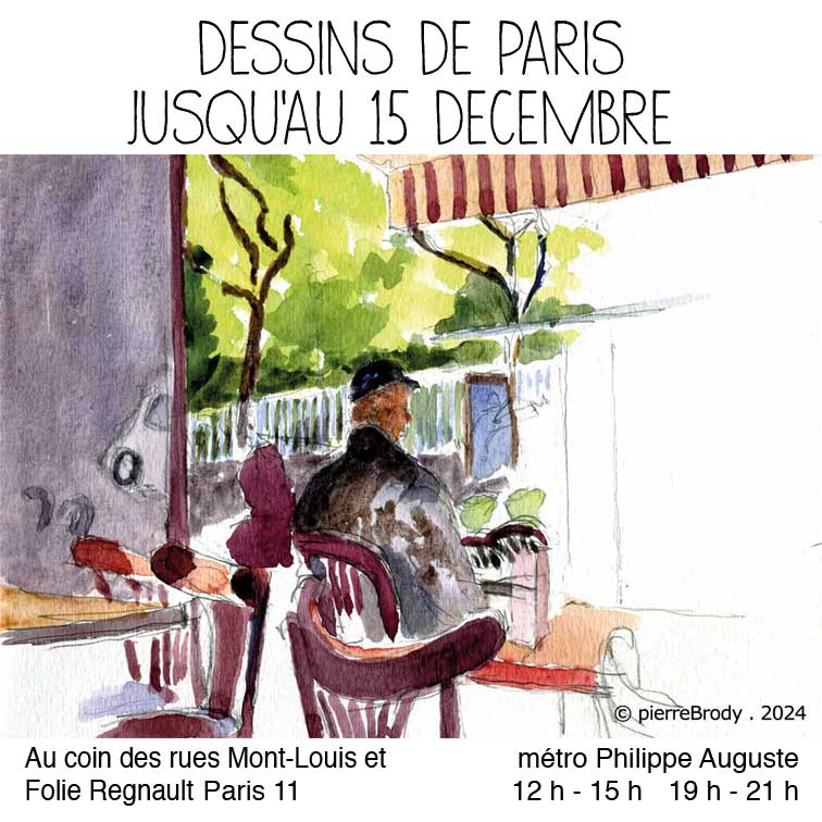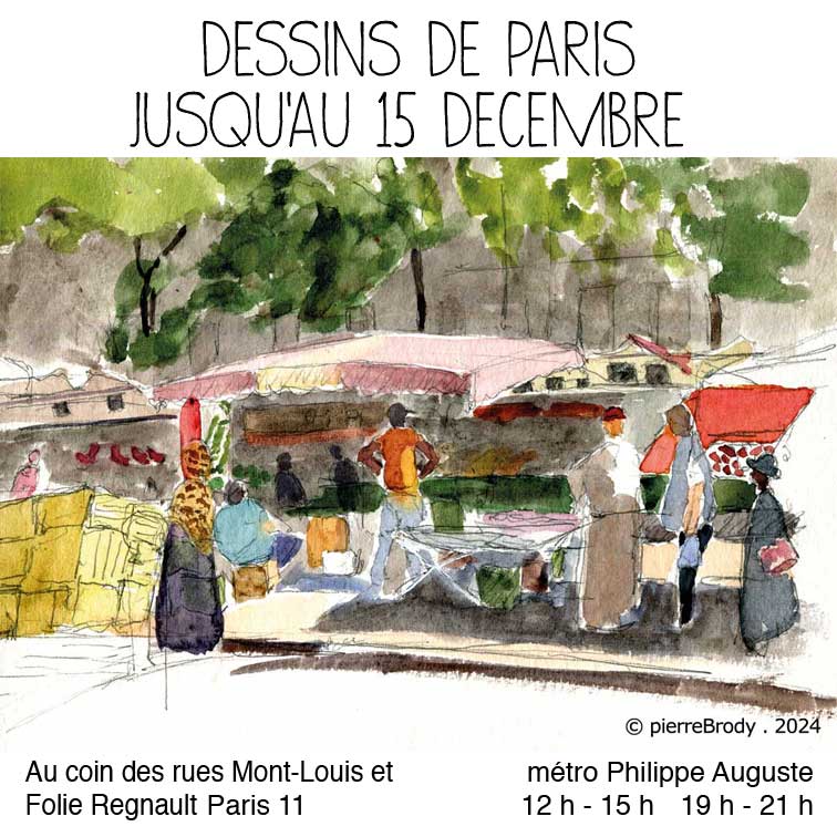 Dessins présentés à mon exposition. Le premier du marché de Belleville. Les autres du Café Pierre, près de la République.