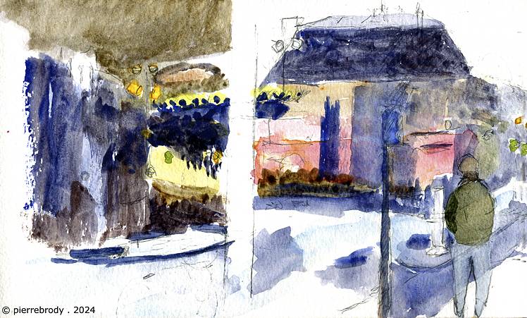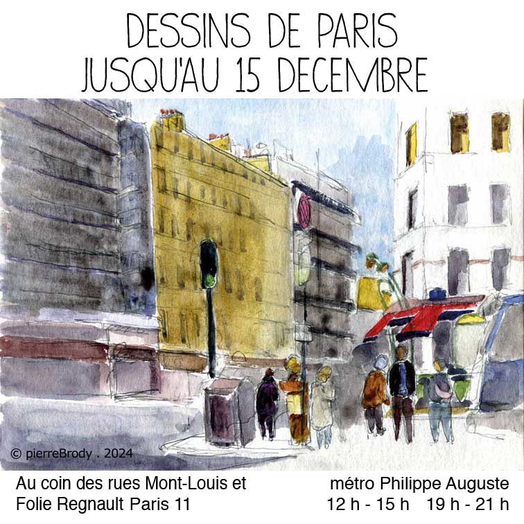 Dessins présentés à mon exposition. Le premier de la terrasse du café Aux Folies, les suivants du boulevard de Belleville.